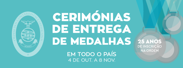 A Ordem promove, entre 4 de outubro e 8 de novembro, as cerimónias de entrega de medalhas aos contabilistas certificados que tenham completado 25 anos de inscrição.