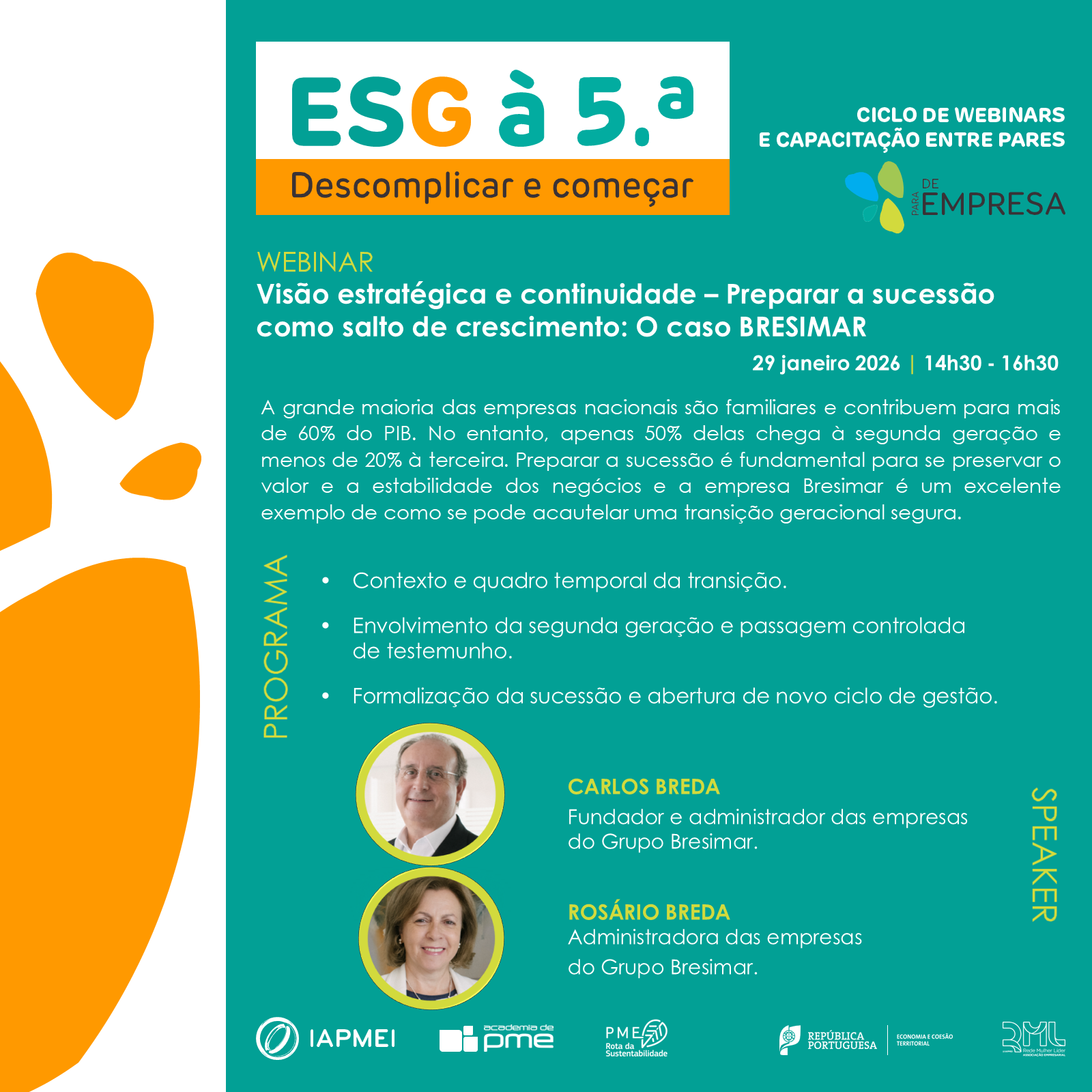 No próximo webinar ESG à 5.ª, de 29 de janeiro, o IAPMEI traz o tema da sucessão empresarial para o centro do debate e recebe a empresa Bresimar, um caso exemplar de estratégia para a continuidade dos negócios.
