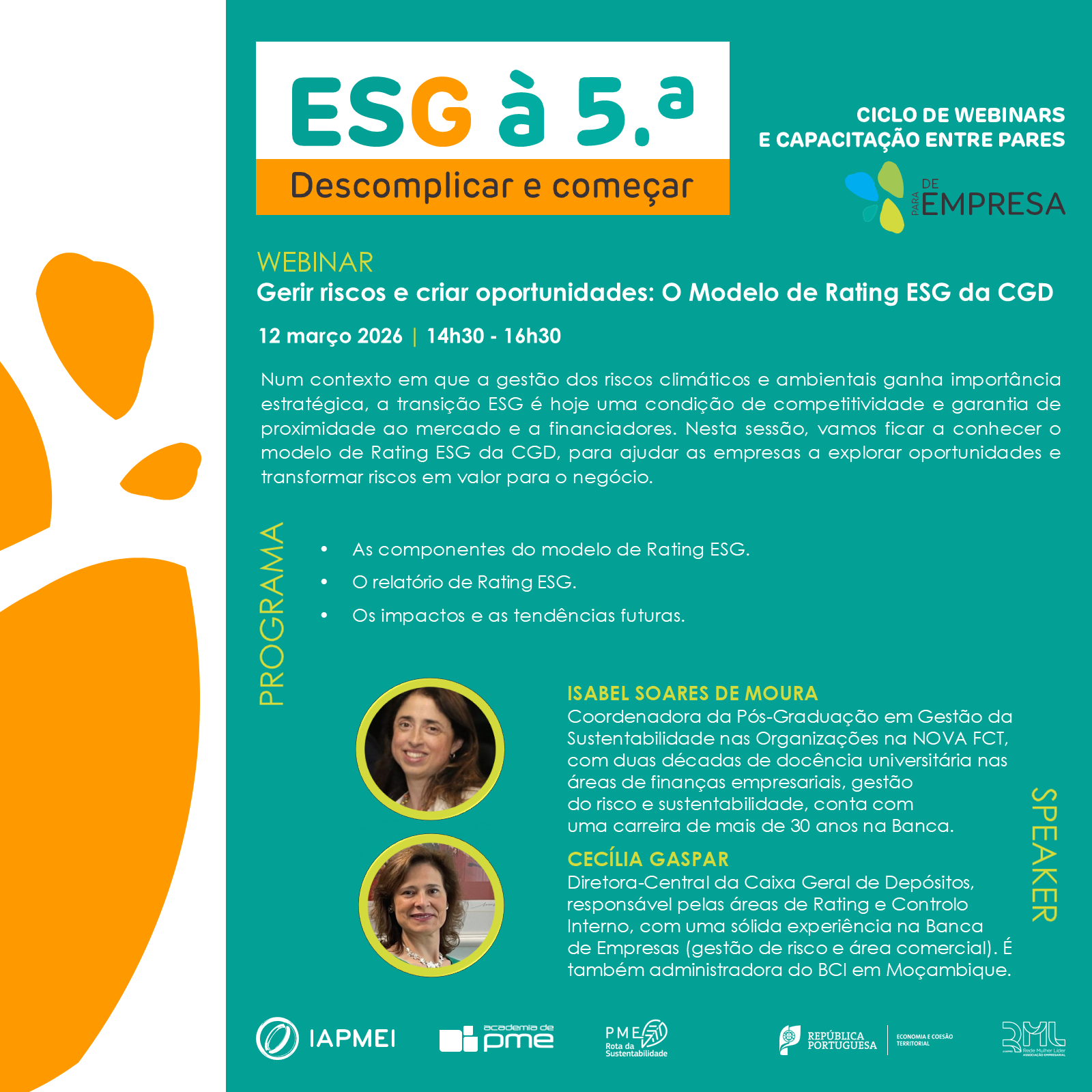 Para a abordagem do tema, o IAPMEI recebe como convidadas especiais Isabel Soares de Moura, docente universitária e coordenadora da pós-graduação em Gestão da Sustentabilidade nas Organizações na NOVA FCT, com uma carreira de mais de 30 anos na Banca, e Cecília Gaspar, diretora-central da Caixa Geral de Depósitos, responsável pelas áreas de Rating e Controlo Interno, com uma vasta experiência na Banca de Empresas.